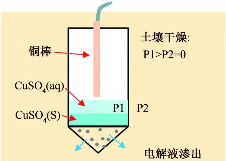 (3) 內(nèi)阻增大:隨著土壤離子滲入?yún)⒈入姌O或電極內(nèi)溶液漏失,銅棒表面會發(fā)生氧化反應,原純銅-硫酸銅電極體系發(fā)生改變,這會導致電位發(fā)生變化。同時,提供離子通道的滲漏材料如果選擇不當或受污染,也會阻礙離子滲透速,增加參比電極的接觸電阻。