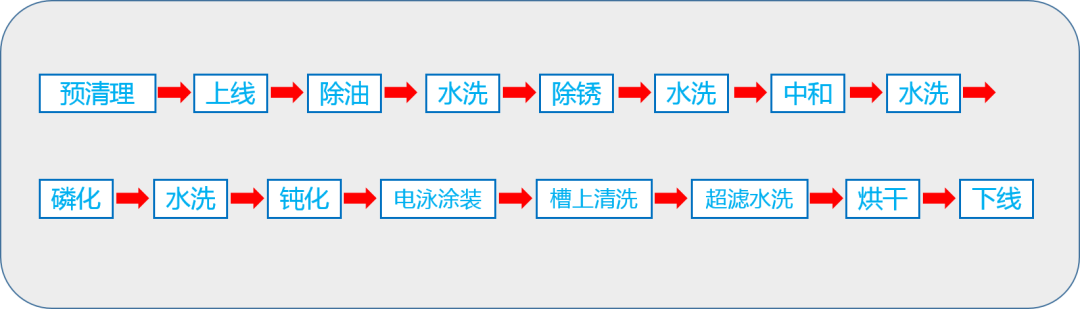 一般金屬表面的電泳涂裝,其工藝流程為: