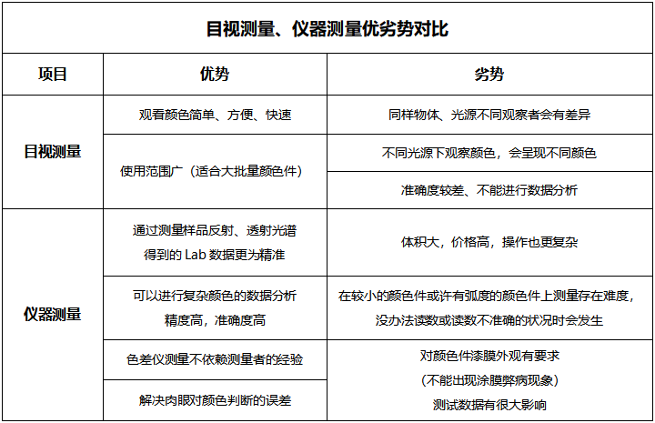 對顏色的判定一般有兩種方式,一種是目視,另一種是通過儀器測量,這兩種方法都是最為常見的測試方法,也有著不一樣的優(yōu)勢與劣勢。