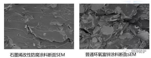 石墨烯改性防腐涂料與普通環(huán)氧富鋅涂料斷面SEM對比