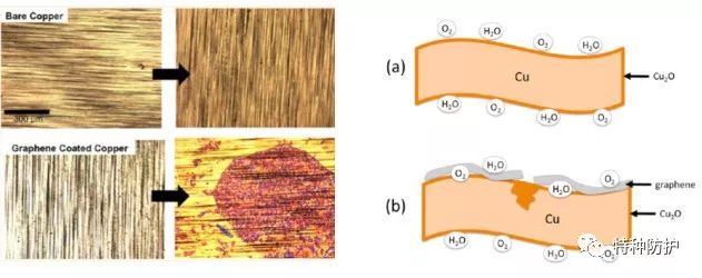 石墨烯涂層和裸銅腐蝕對比及銅表面腐蝕示意圖
