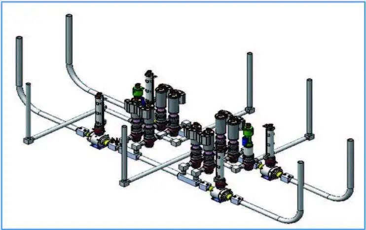 雙相不銹鋼中鐵素體與奧氏體各約占50%,較少相含量最少達到30%。雙相不銹鋼兼具奧氏體不銹鋼和鐵素體不銹鋼的優(yōu)點:與鐵素體不銹鋼相比,雙相不銹鋼塑性、韌性更高,室溫脆性、耐晶間腐蝕性能和焊接性能明顯提高;與奧氏體不銹鋼相比,雙相不銹鋼強度高且耐晶間腐蝕、耐氯化物應(yīng)力腐蝕性能提高。水下生產(chǎn)設(shè)施需具有較長的服役壽命和極高的可靠性,因為它一旦失效可能造成嚴重的后果且維護費用高昂。雙相不銹鋼在耐點蝕、耐縫隙腐蝕、耐應(yīng)力腐蝕方面性能優(yōu)異,廣泛應(yīng)用于中心管匯主工藝管線、小口徑儀表管、閥門等。流花某氣田中心管匯的主工藝管線、管件使用材料為S31803雙相不銹鋼,管線三維圖如圖2所示,該中心管匯經(jīng)過了防腐蝕涂裝。
