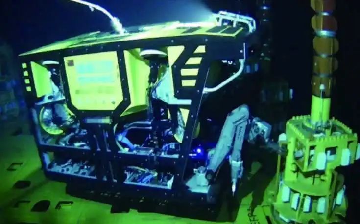 涂料性能是長效防腐蝕的關(guān)鍵,陰極保護對涂層有剝離作用,因此在選擇防腐蝕涂層時,應(yīng)考慮涂層的電性能、力學(xué)性能、化學(xué)性能等。受制造、空間等限制,熱固性交聯(lián)融結(jié)環(huán)氧等屏蔽性能較佳的涂層在管線上不便實施,因此水下中心匯管常采用液態(tài)環(huán)氧涂料。雙相不銹鋼是一種特殊的合金材料,液態(tài)涂料在其表面的浸潤性相對較差,必須選擇附著力優(yōu)良的涂層體系。NORSOK M-501標準推薦的涂裝系統(tǒng)中,油漆類型為雙組分環(huán)氧/環(huán)氧酚醛,最小干膜厚度為350 μm,最小涂裝遍數(shù)為2遍,顏色為黃(RAL1004)。深水防腐蝕涂層系統(tǒng)與深水陰極保護系統(tǒng)必須很好地兼容,這就要求涂層具有良好的耐陰極剝離及耐海水浸泡性能。通過最少4200小時的常溫海水浸泡和陰極剝離兩項測試,評估涂層的附著力、耐滲透性、致密性、腐蝕蔓延性以及耐電流的剝離性等。如果管線操作溫度超過50 ℃,還應(yīng)在不低于最高服役溫度下對涂層再進行陰極剝離測試。常溫管線涂層可采用雙組分厚漿型環(huán)氧,溫度較高時采用環(huán)氧酚醛。環(huán)氧酚醛有很高的交聯(lián)密度,自由體積小,溫度較高時其高交聯(lián)的網(wǎng)絡(luò)使水分子、離子等難以通過,因此耐溫性通常優(yōu)于環(huán)氧。為確保涂層的防腐蝕性能,推薦對深水涂層進行額外的高壓浸泡測試,利用電化學(xué)、光譜、表面分析等方法檢驗涂層在高壓、低溫下的性能及其變化。涂層厚度不應(yīng)低于350 μm,適當增加厚度可增強涂層對腐蝕介質(zhì)的屏蔽能力,阻止?jié)B透。圖4為水下機器人(ROV)在水下對管線進行操作,深水能見度極低,為便于觀察,管線面漆顏色宜采用辨識度較高的黃色RAL1004。