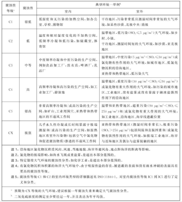 對于大氣腐蝕等級,《金屬和合金的腐蝕 大氣腐蝕性第1部分:分類測定和評估》GB/T19292.1-2018對大氣腐蝕等級需經(jīng)過一年期對碳鋼、鋅、銅、鋁金屬腐蝕速率的實驗得出,為方便做出預(yù)估,有關(guān)腐蝕等級評估的典型大氣環(huán)境類型,在附錄中給出了參考,見表2: