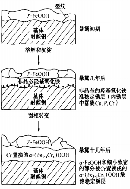 耐候鋼,即耐大氣腐蝕鋼,通過在鋼中加入少量Cu、P、Cr、Ni等合金元素,使鋼鐵材料表面在大氣環(huán)境下生成一層約致密、具有保護(hù)性的銹層,抑制腐蝕介質(zhì)向基體滲透,達(dá)到“以銹止銹”的效果。在大氣腐蝕過程中,耐候鋼表面銹層結(jié)構(gòu)不斷演變,越來越致密,保護(hù)性越來越好,可阻隔腐蝕介質(zhì)滲透,減緩腐蝕,從而達(dá)到保護(hù)基體的目的。