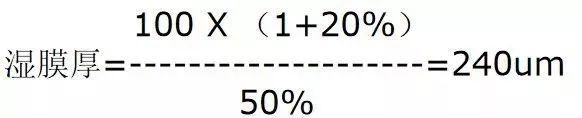 例:固體含量為50%的油漆,稀釋20%后,要施工厚度為100um的干膜。為確保 達到所指定的干膜厚度,油漆所施工的濕膜厚度應(yīng)為多少呢?