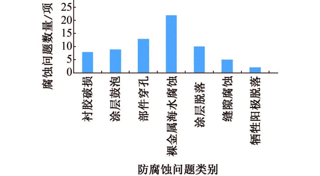 根據(jù)已建立的設(shè)備預(yù)防性防腐蝕管理體系,在防腐蝕大綱系統(tǒng)分大綱的編制過程中,應(yīng)了解現(xiàn)場設(shè)備及其腐蝕狀況,通過防腐蝕措施更替或修復(fù)措施使設(shè)備防腐蝕措施的整體性能參數(shù)不降低或至少達(dá)到原同等水平,不至于影響其預(yù)期功能甚至影響整個設(shè)備和系統(tǒng)的預(yù)期功能。在制定針對單個具體設(shè)備的預(yù)防性防腐蝕實(shí)施項(xiàng)目時,應(yīng)根據(jù)設(shè)備防腐蝕措施使用或操作說明書確定防腐蝕措施的固有壽命周期。根據(jù)設(shè)備重要性確定在其固有壽命周期內(nèi)設(shè)備預(yù)防性防腐蝕檢查或修復(fù)的次數(shù),重視設(shè)備防腐蝕狀態(tài)變化的根本原因分析,審慎確定當(dāng)前防腐蝕狀態(tài)影響防腐蝕項(xiàng)目實(shí)施周期的定量化判據(jù)。某核電機(jī)組某次大修共計完成的71項(xiàng)防腐蝕檢查,主要包括襯膠破損、襯膠鼓泡、部件穿孔、裸金屬海水腐蝕、涂層脫落、縫隙腐蝕、犧牲陽極脫落等,防腐蝕問題類別對應(yīng)的腐蝕問題事件數(shù)量如圖2所示??梢钥闯?,裸金屬海水腐蝕在所有腐蝕問題事件中占比最大,這些腐蝕問題可能與管道選材、防腐蝕措施選用不當(dāng)有較大關(guān)系,而襯膠破損、涂層脫落等更多與襯膠、涂裝工藝與表面預(yù)處理有關(guān),這些問題應(yīng)在防腐處理實(shí)施工藝控制(含人員資質(zhì)及施工質(zhì)量過程控制)規(guī)程中予以更多關(guān)注。