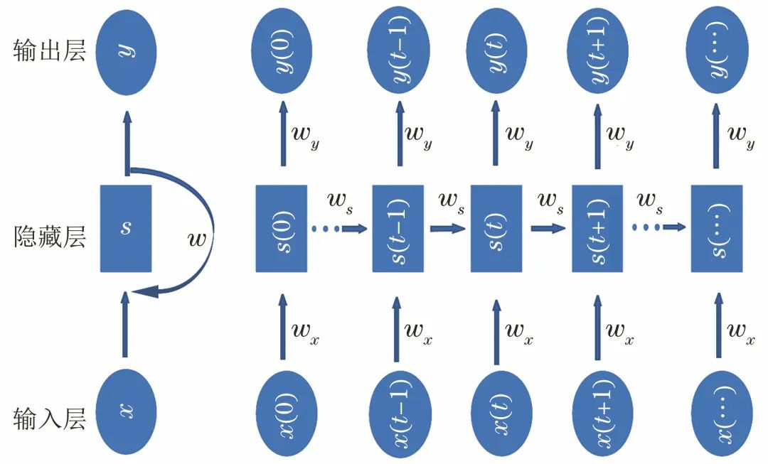 循環(huán)神經(jīng)網(wǎng)絡(luò)(RNN)是在神經(jīng)網(wǎng)絡(luò)的基礎(chǔ)之上對(duì)序列特征的數(shù)據(jù)做了改進(jìn),將隱藏層的神經(jīng)元結(jié)構(gòu)通過(guò)新的權(quán)值連接起來(lái),使得隱藏層之間的神經(jīng)元不在是獨(dú)立的個(gè)體,而是與序列前一步的神經(jīng)元相關(guān),如圖2所示。