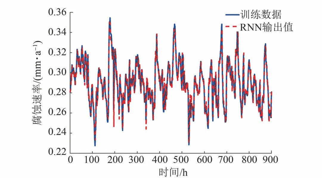 采用某化工廠腐蝕探針監(jiān)測(cè)到的1000小時(shí)內(nèi)的腐蝕速率數(shù)據(jù)建立RNN時(shí)序模型并對(duì)其有效性進(jìn)行了驗(yàn)證。選取前90%數(shù)據(jù)作為訓(xùn)練數(shù)據(jù)進(jìn)行RNN建模運(yùn)算,后10%數(shù)據(jù)作為測(cè)試數(shù)據(jù)以驗(yàn)證預(yù)測(cè)模型的有效性。在RNN訓(xùn)練建模過(guò)程中,將訓(xùn)練數(shù)據(jù)中的前七組數(shù)據(jù)作為輸入端數(shù)據(jù),第八組數(shù)據(jù)作為輸出端數(shù)據(jù)進(jìn)行訓(xùn)練。隱藏層神經(jīng)元數(shù)量設(shè)置為15個(gè),迭代次數(shù)為2000次。訓(xùn)練結(jié)果如圖3所示