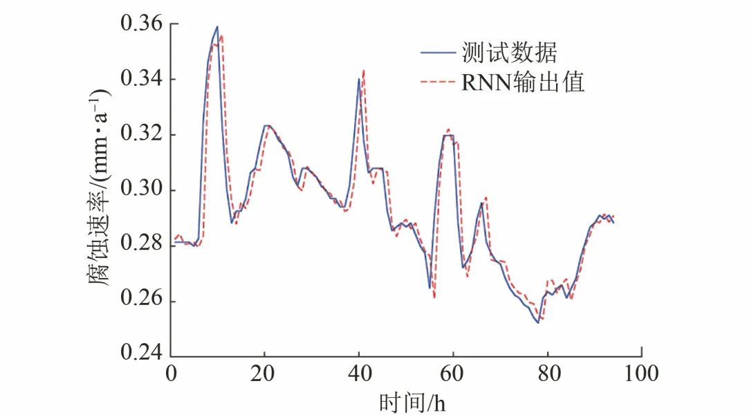 從圖3中可以看出,經(jīng)過(guò)迭代訓(xùn)練之后,基于RNN的輸出值能夠擬合訓(xùn)練數(shù)據(jù)的真實(shí)值。因此,經(jīng)過(guò)訓(xùn)練后的RNN的輸出結(jié)果可以反映訓(xùn)練數(shù)據(jù)中腐蝕速率的變化規(guī)律。