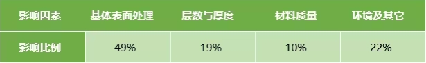有機涂料覆蓋層防腐蝕壽命的決定因素有材料質(zhì)量、涂層厚度、施工質(zhì)量和使用環(huán)境等,一般影響涂層使用壽命的因素比例如下: