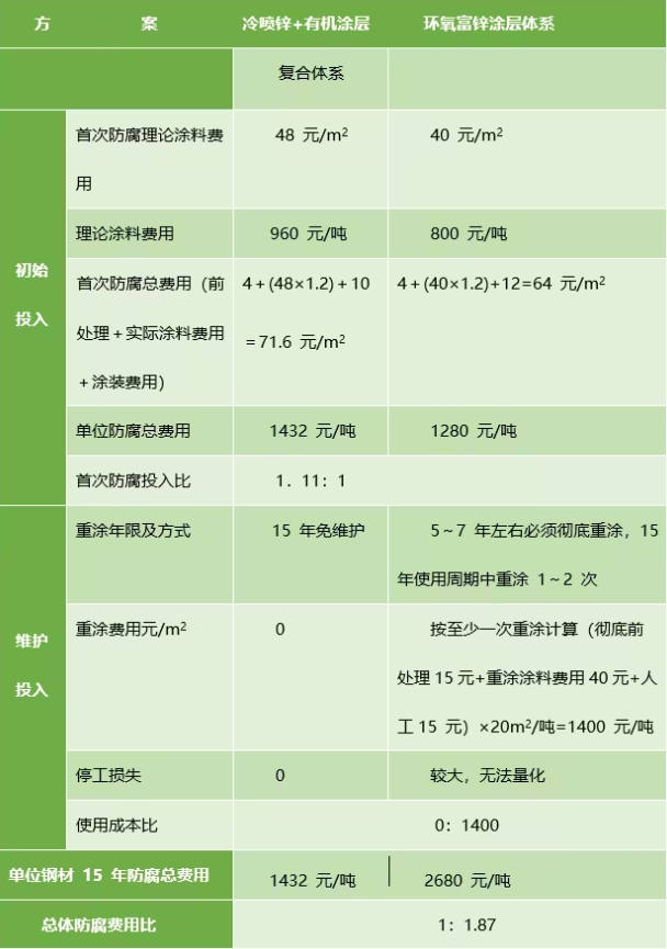 一般按照電廠所處地區(qū)的環(huán)境條件的不同按以上順序選擇合理的涂裝材料。筆者認為內(nèi)陸地區(qū)可選用環(huán)氧富鋅底漆配套環(huán)氧云鐵中間漆和氯化橡膠面漆;在沿海地區(qū)由于環(huán)境濕度大,空氣中含鹽粒子量大,一般采用環(huán)氧富鋅類油漆 3-7 年就需要維護性涂裝,且可維護性較差,可采用全壽命周期內(nèi)經(jīng)濟性較好的冷噴鋅復合涂層方案。3.2 沿海大氣環(huán)境火力發(fā)電廠露天鋼結(jié)構(gòu)兩種腐蝕防護涂裝方案的經(jīng)濟比較