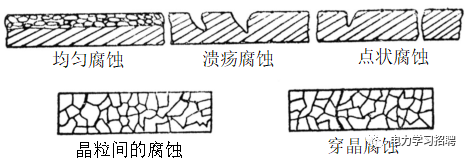 (二) 局部腐蝕。局部腐蝕只在金屬表面的局部位置產(chǎn)生腐蝕,結果形成潰瘍狀、點狀和晶粒間腐蝕等。圖中所示的是各種腐蝕形狀。