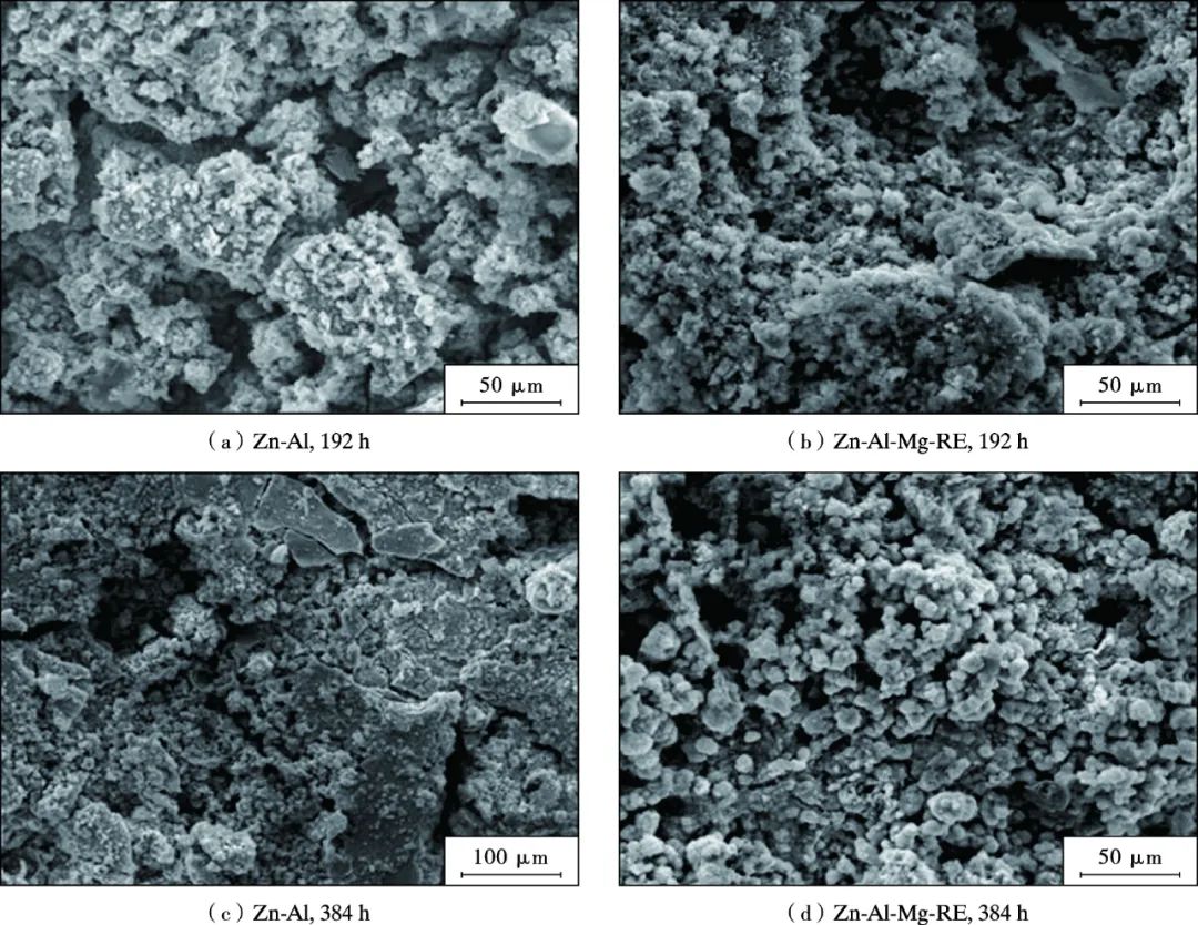 圖1 Zn-Al和Zn-Al-Mg-RE涂層在鹽霧試驗不同時間時的表面SEM形貌[45]