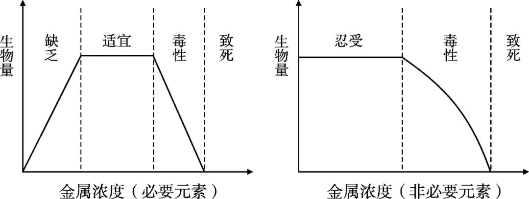 圖2 生物必要和不必要元素的的含量和生物量的關(guān)系[56]