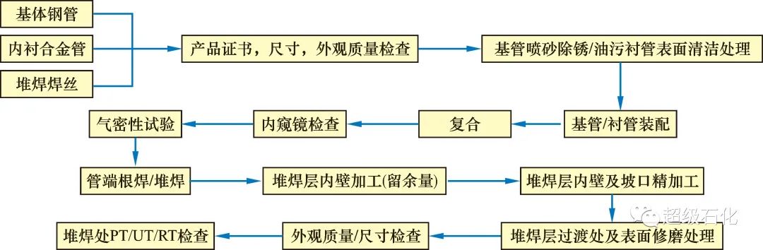 雙金屬復(fù)合管分為機(jī)械復(fù)合和冶金復(fù)合,其中以機(jī)械復(fù)合居多,即將碳鋼基管和不銹鋼管穿在一起采用水壓、爆炸及旋壓等方法生產(chǎn),工藝流程如圖1所示。