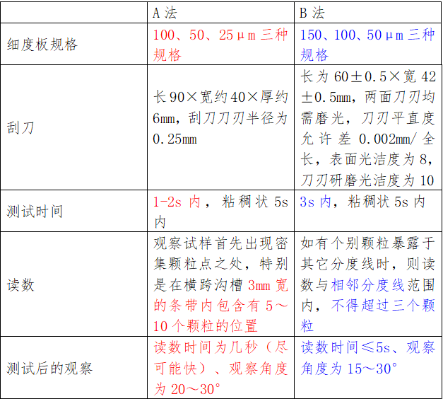 刮板細度計法的測試原理,是利用刮板細度計上打楔形溝槽將涂料刮出一個楔形層,用肉眼辨別濕膜內(nèi)顆粒出現(xiàn)的顯著位置以得出細度讀數(shù)。目前常用的國家標準方法有:GB/T 1724-2017《色漆、清漆和印刷油墨 研磨細度的測定》(修改采用國際標準ISO 1524:2013)。包含了A法、B法兩種檢測方法,其中A法即延續(xù)了老標準GB/T 6753.1。