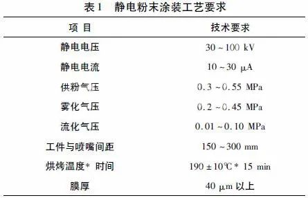靜電粉末噴涂法是在工業(yè)涂裝領(lǐng)域中占主導(dǎo)位置的粉末涂裝法。簡單斷面或僅要求裝飾面的鋁合金材料一般采用靜電粉末噴涂技術(shù),完善優(yōu)化的涂裝工藝要求見表1。