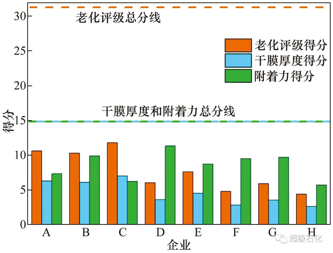 圖1 8家煉化企業(yè)防腐涂層各項得分