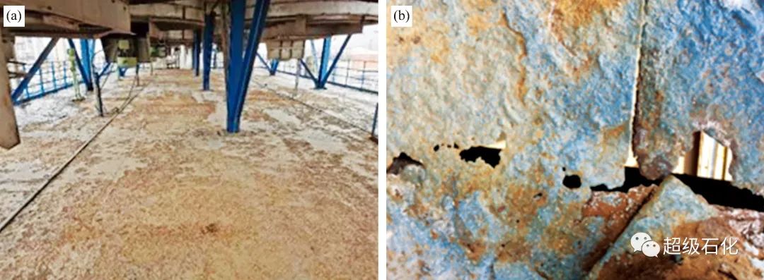(3)在鋼結(jié)構(gòu)平臺使用期間,花紋板普遍存在因積液、污垢清理不及時而導(dǎo)致防腐蝕涂層的失效問題,且涂層大面積損壞后未能進(jìn)行及時修復(fù)。