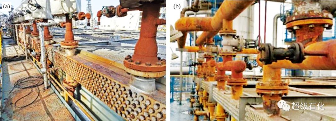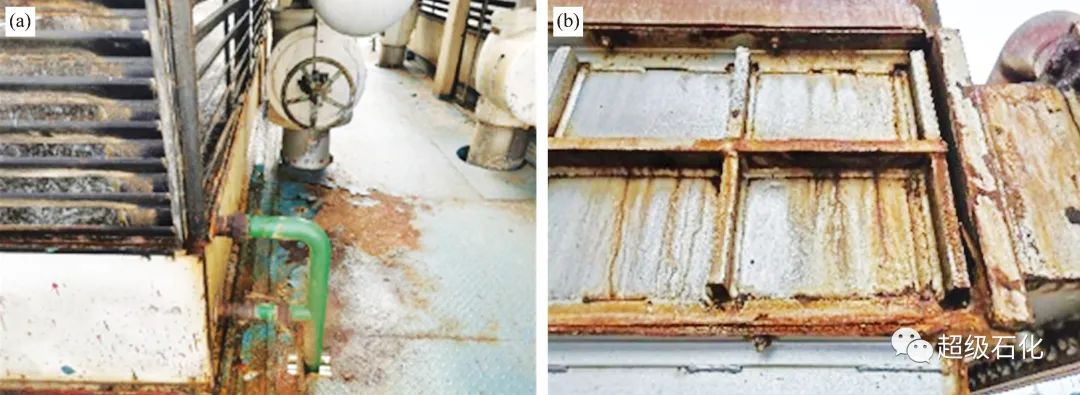 (6)濕式空冷器及周圍設(shè)施的腐蝕情況見圖6。由圖6看出,煉化企業(yè)采用濕式空冷器,外腐蝕普遍較為嚴(yán)重,除設(shè)備本體發(fā)生腐蝕外,飛濺的噴淋水導(dǎo)致平臺及周圍設(shè)備、管道和鋼結(jié)構(gòu)也發(fā)生了嚴(yán)重腐蝕。