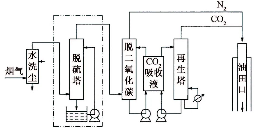 脫硫工序可采用干法脫硫、半干法脫硫、濕法脫硫以及一系列新型脫硫方法;脫碳的方法較多,油田現(xiàn)場(chǎng)多采用醇胺溶液等吸收煙氣中的CO2,再對(duì)吸收液進(jìn)行解吸,實(shí)現(xiàn)CO2分離。此外,還可以采用煙道氣回收利用一體化技術(shù),在實(shí)現(xiàn)煙道氣回收注入的同時(shí),完成污水凈化處理及煙氣余熱利用。