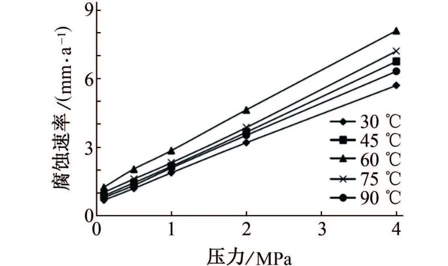 圖4 不同溫度下壓力對(duì)N80鋼腐蝕速率的影響