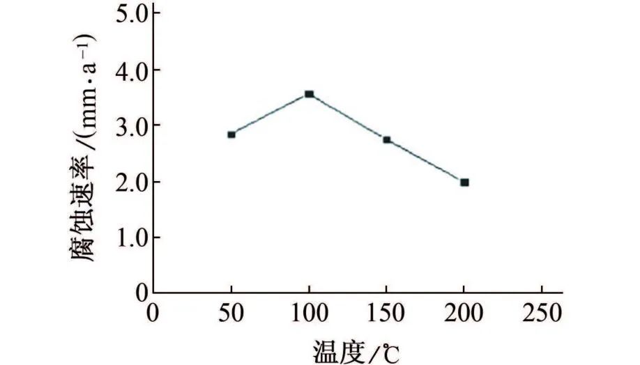 煙道氣回收及注入系統(tǒng)的腐蝕程度也會(huì)受溫度影響,主要原因是氣體的溶解度和腐蝕產(chǎn)物膜會(huì)隨溫度發(fā)生變化。陳龍俊研究發(fā)現(xiàn),在O2+CO2環(huán)境中,溫度的升高會(huì)加速電化學(xué)、化學(xué)和傳質(zhì)等與腐蝕相關(guān)的過程,同時(shí)會(huì)降低H2CO3和HCO3-的含量,在30~80 ℃條件下Q345R鋼的腐蝕速率隨著溫度的升高而增大。李威發(fā)現(xiàn),在含80% N2、18% CO2、2% O2和0.0001% SO2的NaCl溶液中,在30~90 ℃條件下N80鋼的腐蝕速率隨溫度的升高先增大后迅速減小,在60 ℃時(shí)腐蝕速率達(dá)到最大。這主要與腐蝕產(chǎn)物膜有關(guān),在30 ℃和60 ℃時(shí)腐蝕產(chǎn)物膜疏松多孔,在90 ℃時(shí)腐蝕產(chǎn)物膜較致密,對(duì)基體的保護(hù)作用也增強(qiáng)。李臻等發(fā)現(xiàn)在含CO2和O2的模擬采出水環(huán)境中,在低溫(50 ℃)下N80鋼的腐蝕類型以均勻腐蝕為主,在100 ℃下N80鋼的局部腐蝕明顯加劇,而在高溫(150 ℃和200 ℃)下,局部腐蝕明顯減輕,以均勻腐蝕為主。圖5為CO2和O2共存環(huán)境中不同溫度下N80鋼的平均腐蝕速率,可見N80的腐蝕速率隨著溫度的升高呈先增大后減小的趨勢(shì),并在100 ℃時(shí)腐蝕速率達(dá)到峰值,在200 ℃時(shí)腐蝕速率最小,分析認(rèn)為這主要與不同溫度下腐蝕產(chǎn)物膜的結(jié)構(gòu)有關(guān)。