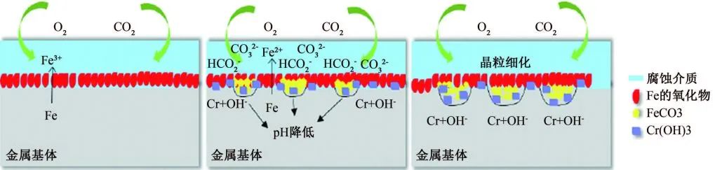受材料耐蝕性及腐蝕產(chǎn)物膜組織結(jié)構(gòu)的影響,煙道氣對(duì)不同材料的腐蝕程度也不同。目前煙道氣回收及注入系統(tǒng)的設(shè)備及設(shè)施主要使用碳鋼或低合金鋼,添加Cr、Ni、Mo和Si等元素可以提高材料的耐蝕性。在CO2、O2共存溶液中,隨著P110鋼中Cr含量的增加,材料的腐蝕速率逐漸減小,P110-7Cr鋼的腐蝕速率為0.898 mm/a,僅為P110鋼的1/6。P110、P110-2Cr和P110-3Cr鋼會(huì)發(fā)生局部腐蝕,且隨著Cr含量的增加,蝕坑平均深度減小,平均面積增大;而P110-5Cr和P110-7Cr鋼表面呈現(xiàn)均勻腐蝕形貌,這主要是由于在CO2、O2共存環(huán)境中Fe和Cr元素均參與陽極反應(yīng),使得蝕坑內(nèi)部局部區(qū)域pH降低,溶液中的HCO3-及CO32-擴(kuò)散至蝕坑內(nèi)部,增大了FeCO3過飽和度,F(xiàn)eCO3形核速率增大,蝕坑底部局部位置晶粒細(xì)化,這對(duì)腐蝕起到一定的抑制作用。隨著P110鋼中Cr含量的增加,晶粒尺寸逐漸增大,其演變機(jī)理如圖6所示。