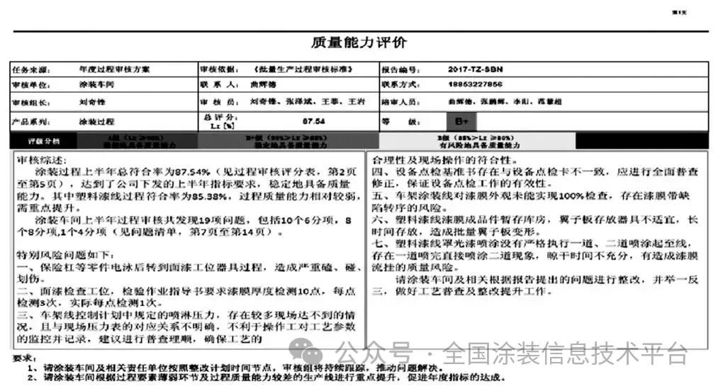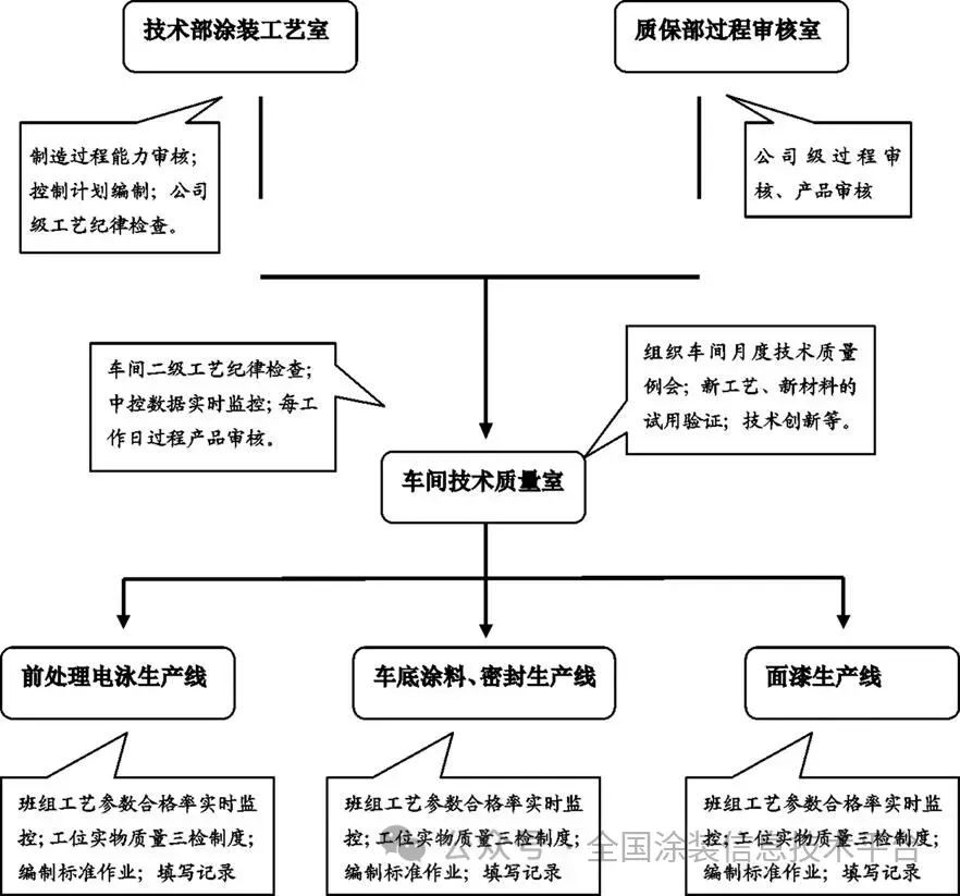 涂裝車間工藝技術(shù)的管理,需要從公司職能部室、車間、班組建立起三級管理框架體系,其中公司級的包含工藝紀(jì)律檢查、過程審核、控制計(jì)劃編制、制造過程能力審核;車間級的包含工藝紀(jì)律檢查、中控?cái)?shù)據(jù)實(shí)時(shí)監(jiān)控、過程產(chǎn)品審核、月度技術(shù)質(zhì)量例會、新工藝、新材料的試用驗(yàn)證、技術(shù)創(chuàng)新等;班組級的有工藝參數(shù)合格率實(shí)時(shí)監(jiān)控、工位實(shí)物質(zhì)量三檢制度、編制標(biāo)準(zhǔn)作業(yè)、填寫各項(xiàng)記錄等。