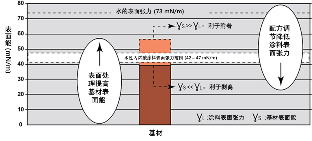 通常認為,涂料的表面張力需低于基材表面能10 mN/m以上才可以實現(xiàn)較好的潤濕。因此,配方里的潤濕劑通過有效降低涂料的表面張力,進而影響最終的附著力,而基材的表面能則可以通過表面處理進行調(diào)節(jié)。