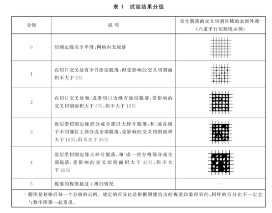 劃格法附著力測(cè)試標(biāo)準(zhǔn)主要有GB/T 9286-2021/IDT,ISO 2409、ASTM D 3359。其測(cè)試方法和描述基本相同,只是對(duì)于附著力級(jí)別的說(shuō)明次序剛好相反。ASTM D 3359是5B-OB級(jí)由好到壞,而ISO 2409是0-5為由好到壞。
