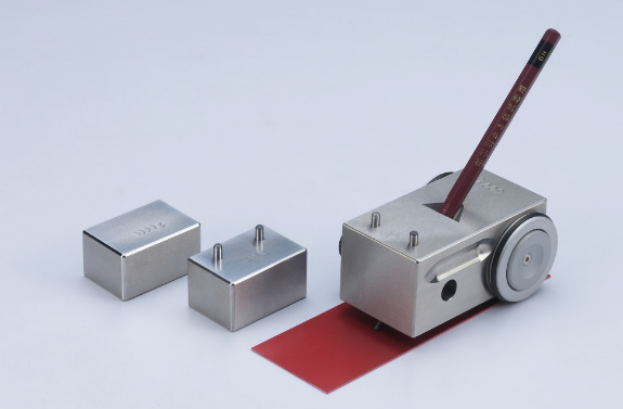 鉛筆硬度計是按手工操作而設計制造的,是以鉛筆標號表示。三點接觸被測表面(兩點為兩輪,一點為鉛筆筆芯)始終保證鉛筆與被測涂膜形成45度夾角,用力水平推動鉛筆硬度計運動,即可完成測試過程,以測定涂膜抵抗變形的能力。