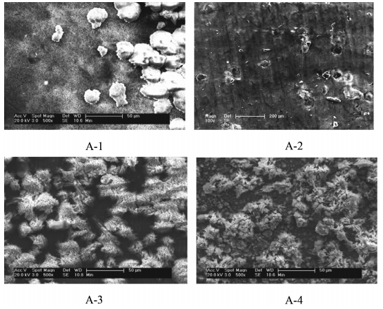 本次實(shí)驗(yàn)采取人造海水,在室溫狀態(tài)下,模擬深海環(huán)境條件:低溫(4±1)℃和低氧含量(2±1)mg/L。采用恒電流進(jìn)行陰極極化,使得電流密度分別為400 mA/m2、100 mA/m2、50 mA/m2、40 mA/m2串聯(lián)進(jìn)行一周的實(shí)驗(yàn)測(cè)試。并通過(guò)掃描電鏡SEM、X 射線(xiàn)能譜對(duì)得到的樣品層進(jìn)行顯微觀察、成分分析,研究垢層的晶體結(jié)構(gòu),分析其致密情況。