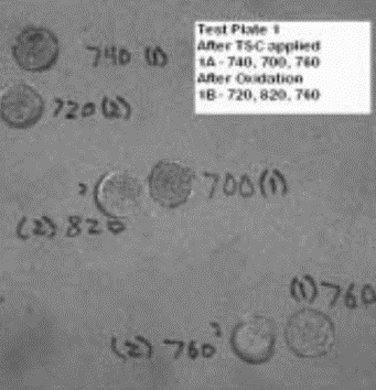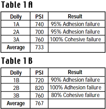 后續(xù)現(xiàn)場試驗的目的是確定熱噴涂涂層的天然氧化而形成的封閉層或者涂覆滲透性封閉漆層對于熱噴涂涂層附著力測試結(jié)果的影響?,F(xiàn)場使用三塊面板分別進(jìn)行了這個試驗。所有的測試面板均用20號鎳礦熔渣介質(zhì)進(jìn)行干式噴砂清理進(jìn)行制備,并達(dá)到SSPC-SP 5,白色金屬噴砂清理清潔等級;制備的表面輪廓高度為102至114微米。一種商用級的雙組分環(huán)氧膠粘劑被用來固定試件。附著力試驗使用了符合ASTM D4541標(biāo)準(zhǔn)所述的方法E,自對準(zhǔn)附著力試驗儀。面板1(圖1)上的熱噴涂金屬涂層的平均厚度為325微米;三個試件被分別沾粘在面板1上,第二天在膠粘劑固化后,進(jìn)行拉拔測試,其結(jié)果表示為1A。三個拉拔結(jié)果的平均附著力值為5.05兆帕,失效界面為涂層與基底的附著力失效,以及熱噴涂金屬涂層的部分內(nèi)聚力失效。然后,將面板1在18到27℃溫度范圍和50至70%的相對濕度條件下放置三個月,使熱噴涂金屬涂層發(fā)生自然氧化。之后,將三個試件再次沾粘在面板1上,第二天在膠粘劑固化后,進(jìn)行拉拔測試,其結(jié)果表示為1B。三個拉拔結(jié)果的平均附著力值為5.28兆帕,失效界面為涂層與基底的附著力失效,以及熱噴涂金屬涂層的部分內(nèi)聚力失效(表1A和1B)。附著力值僅增加了5%,失效模式并沒有發(fā)生變化,這個試驗結(jié)果表明熱噴涂金屬涂層形成的天然氧化物封閉層對熱噴涂涂層的附著性能沒有直接影響。