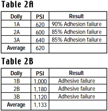 面板2(圖2)熱噴涂金屬涂層的平均厚度為305微米;在面板上沾粘上三個試件,第二天在膠粘劑固化后,進(jìn)行拉拔測試,其結(jié)果表示為2A。三個試件的平均附著力值為4.27兆帕,失效界面為涂層與基底的附著力失效。再將面板在18至27℃和50至70%相對濕度條件下放置三個月,面板表面的熱噴涂金屬發(fā)生自然氧化。然后,涂覆一度厚度為13至38微米的滲透性封閉漆涂層,在427℃和60%相對濕度條件下進(jìn)行強(qiáng)制固化。將三個試件放置在面板2上,第二天在膠粘劑固化后,進(jìn)行拉拔測試,其結(jié)果表示2B。三個試件的平均附著力值為7.8兆帕,附著失效為100%(表2A和2B)。這些試驗結(jié)果表明,封閉漆層對熱噴涂金屬涂層的附著力有一定的影響,附著力值提高了83%。