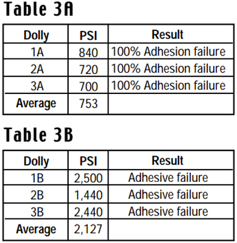 面板3(圖3)熱噴涂金屬涂層的平均厚度為260微米。對面板進(jìn)行一定的遮蓋處理,然后將面板分成兩個區(qū)域部分。將厚度為13至38 微米的封閉漆涂覆在暴露區(qū)域的熱噴涂涂層上。封閉漆固化后,在每個區(qū)域部分上分別放置三個試件,并在第二天進(jìn)行拉拔測試,未涂覆封閉漆區(qū)域部分的測試結(jié)果表示為3A,涂覆封閉漆區(qū)域部分的測試表示3B。未涂覆封閉漆部分的平均附著力值為5.19兆帕,失效模式是基底與涂層的附著力失效。涂覆封閉漆部分的平均附著力值為14.66兆帕, 失效模式是基底與涂層的附著力失效(表3A和3B)。與未涂覆封閉漆部分相比,涂覆封閉漆部分的附著力值增加了183%,試驗結(jié)果表明在熱噴涂應(yīng)用后不久即刻涂覆滲透性封閉漆層,其附著力值有顯著的增加。