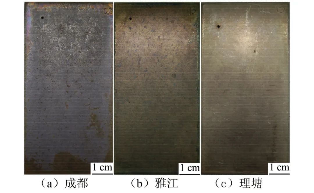 圖2 紫銅在成都、雅江、理塘大氣環(huán)境中暴露一年后的宏觀形貌