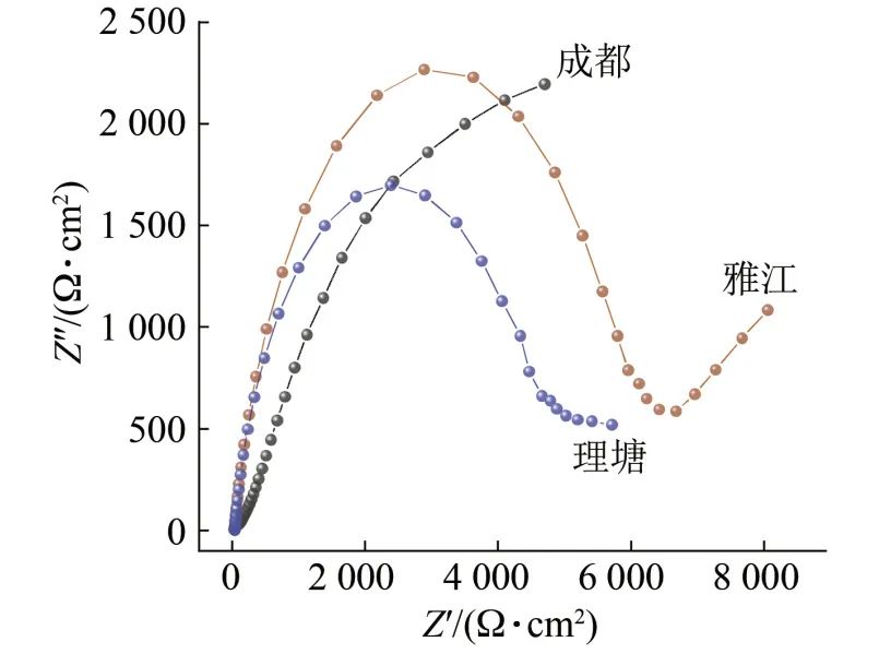 圖4 紫銅在成都、雅江、理塘大氣環(huán)境中暴露一年后的電化學(xué)阻抗譜