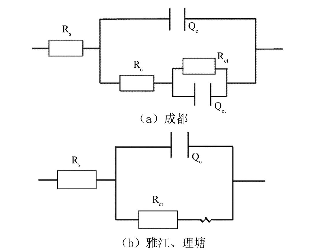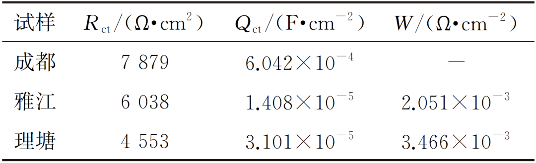 從上述表面形貌分析可知,成都地區(qū)紫銅試樣表面腐蝕產(chǎn)物膜覆蓋完整,相對致密,因此其阻抗值較大;雅江表面腐蝕產(chǎn)物膜比較松散,水和鹽分容易滲透到腐蝕產(chǎn)物膜底部與金屬發(fā)生反應(yīng);理塘紫銅試樣表面腐蝕產(chǎn)物不完整,在電化學(xué)測試時,部分區(qū)域水和鹽分與銅表面直接接觸,電化學(xué)阻抗值較小。腐蝕產(chǎn)物形貌與Nyquist圖和阻抗譜擬合結(jié)果一致。