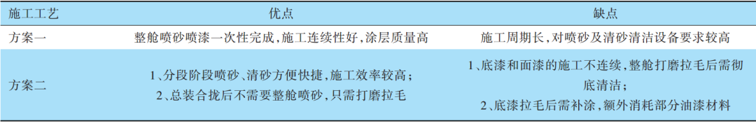 目前淡水艙的涂裝施工工藝主要有兩種:(1)分段階段不噴砂涂裝,在船臺合攏后下水前再進行淡水艙的整體噴砂噴漆施工;(2)分段階段在涂裝車間內噴砂并噴涂底漆50μm,船臺合攏后整體打磨拉毛再施工無溶劑環(huán)氧漆,本文著重介紹此種施工方案。