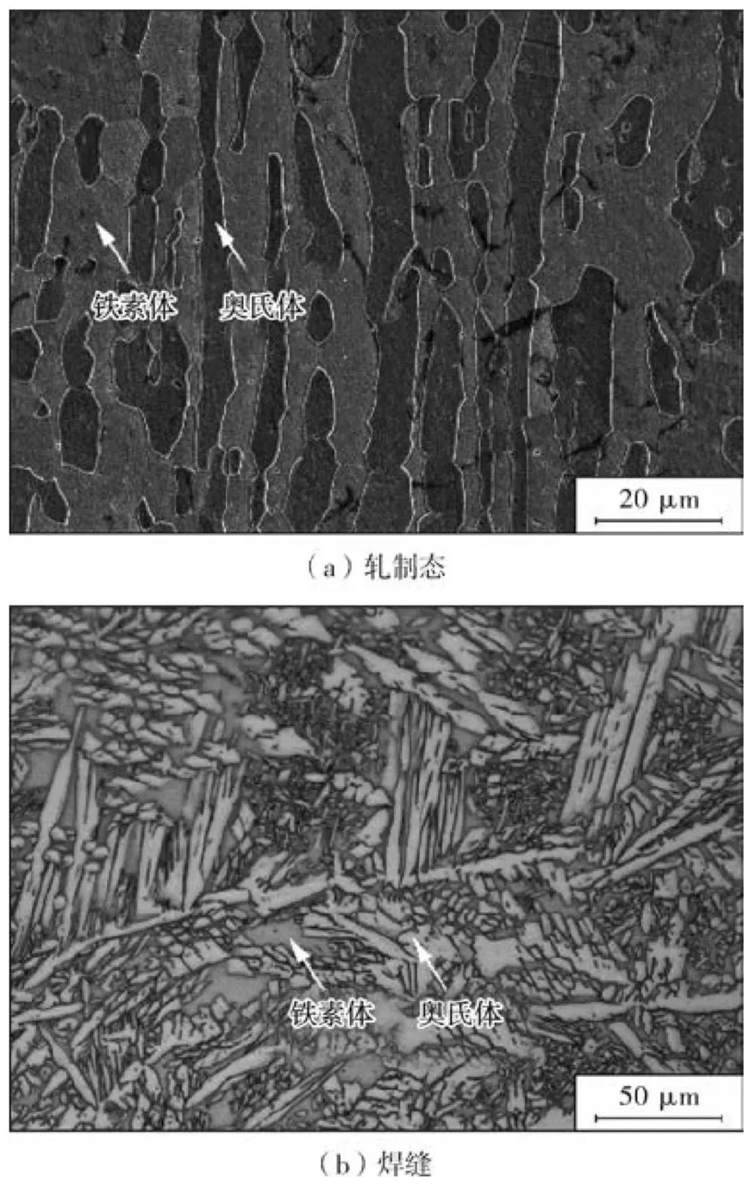 此外,成型加工方法對鐵素體和奧氏體組織形貌具有顯著影響,軋制、拔絲后雙相不銹鋼鐵素體和奧氏體呈帶狀交替分布,而鑄造、焊接成型后的奧氏體在鐵素體基體內(nèi)以分散且相互交割的形式分布,如圖1所示。