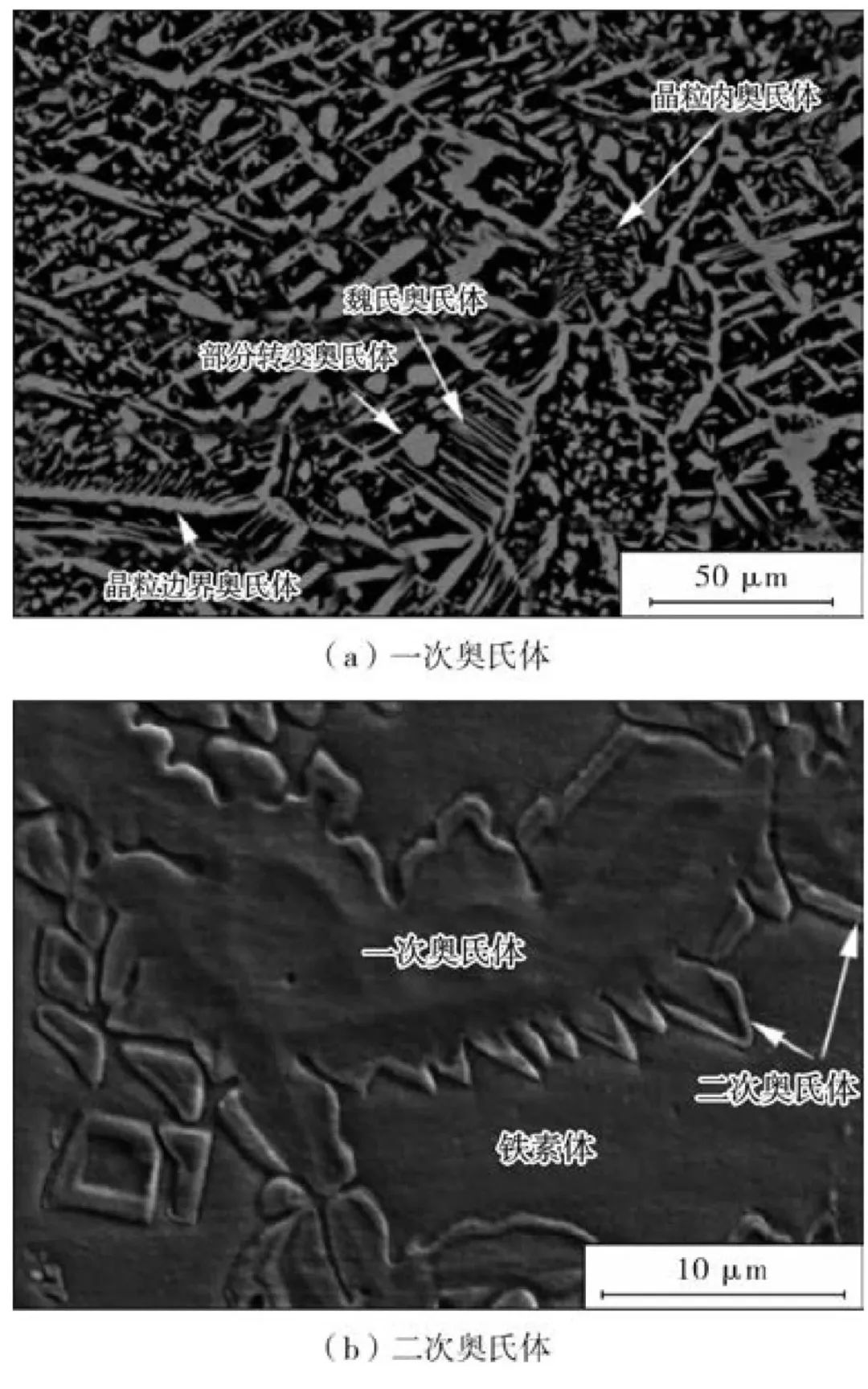先凝固的鐵素體晶粒邊界處原子排列紊亂、能量高,是奧氏體優(yōu)先的形核位置。晶粒邊界奧氏體不需要太大的溫度過冷即可形核,因此形成溫度高。隨著冷卻的進行,晶粒邊界奧氏體含量逐漸增加,邊界處可以利用的有益形核位置減少,新的晶核就會從邊界處以側(cè)板條形式向鐵素體晶粒內(nèi)快速生長,稱之為魏氏奧氏體。如果冷卻速度過快,由于沒有充足的時間形核和長大,魏氏奧氏體形成就會被抑制。