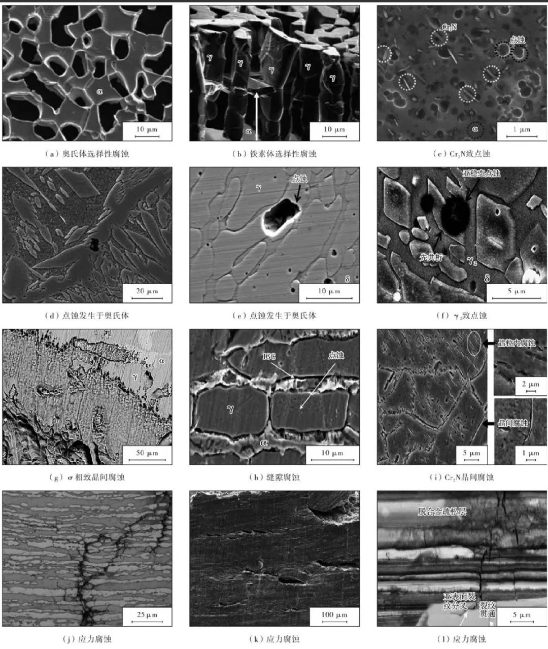 選擇性腐蝕經(jīng)常發(fā)生在由兩種以上物相組成的材料中,比如雙相不銹鋼。不同相的化學(xué)成分不同,耐腐蝕性能也存在明顯差異,選擇性腐蝕往往由耐蝕性較差的弱相決定。