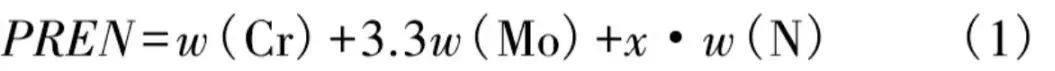 點蝕是在鈍化態(tài)金屬表面的局部區(qū)域以點狀或孔狀向材料內(nèi)部深入發(fā)展的孔洞狀腐蝕現(xiàn)象。不銹鋼耐點蝕性能評價方法主要有全浸失重法、臨界點蝕溫度測試法(ASTM G150)、動電位循環(huán)極化法(ASTM G5)等,其中臨界點蝕溫度測試法因數(shù)據(jù)重復(fù)性好、方法簡單而被廣泛應(yīng)用。臨界點蝕溫度越高,耐點蝕性能越優(yōu)異。耐點蝕指數(shù)(簡稱PREN)可用于預(yù)估雙相不銹鋼的耐點蝕性能。通常PREN值越大,耐點蝕性能越好。PREN與Cr、Mo和N這3種最重要的合金元素含量有關(guān)。根據(jù)這些元素對耐點蝕性能的貢獻大小,PREN的計算公式如下: