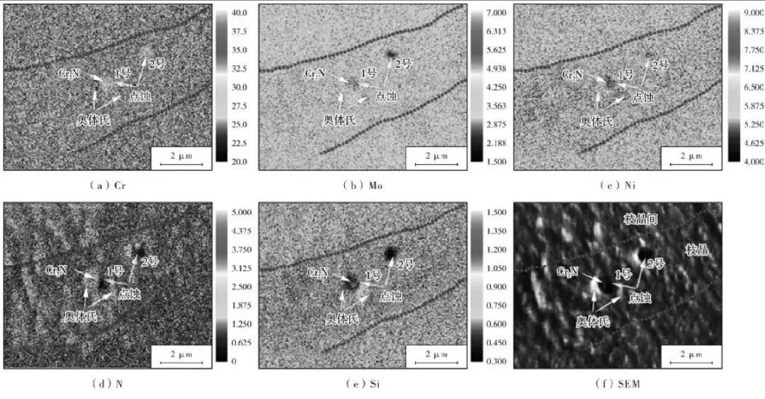 Zhang等指出夾雜與鐵素體或奧氏體邊界處形成的鈍化膜不完整并容易發(fā)生局部腐蝕。但是夾雜不會致使周圍鐵素體或奧氏體形成貧Cr/Mo區(qū)。富Cr和Mo元素的二次相析出可能致使相鄰邊界產(chǎn)生Cr和Mo元素的貧化區(qū),貧化區(qū)的PREN較低,會優(yōu)先發(fā)生點蝕。但最近Erazmus-Vignal等提出了新見解,他們認為Cr2N析出不會導(dǎo)致貧Cr區(qū)形成,局部腐蝕的產(chǎn)生是由Cr2N溶解形成縫隙并進一步加速腐蝕而導(dǎo)致的,如圖4所示。