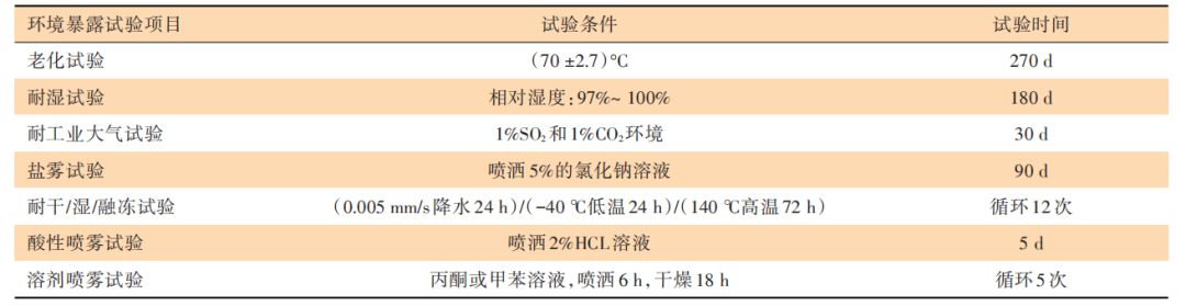 如表1所示,在該標(biāo)準(zhǔn)中,環(huán)境暴露試驗(yàn)由7項(xiàng)檢測項(xiàng)目組成,值得注意的是,UL標(biāo)準(zhǔn)所要求的理化試驗(yàn)時(shí)間最長的高溫老化試驗(yàn)項(xiàng)目長達(dá)270天。完成理化試驗(yàn)后,還需進(jìn)行耐環(huán)境暴露試驗(yàn)后的耐火試驗(yàn)。判定條件依據(jù)未經(jīng)環(huán)境暴露試驗(yàn)的空白樣品的耐火時(shí)間為基準(zhǔn),要求經(jīng)環(huán)境暴露試驗(yàn)的樣品耐火時(shí)間能達(dá)到基準(zhǔn)隔熱時(shí)間的3/4。