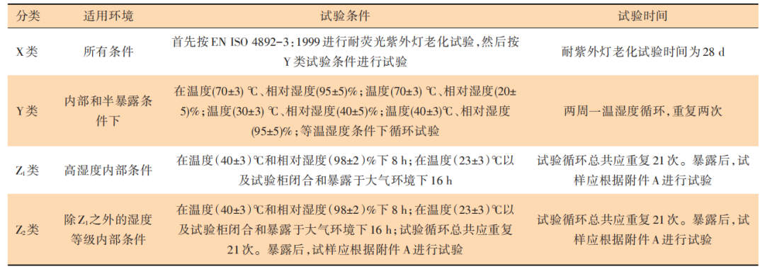 歐洲以ETAG:2006,part2作為指導(dǎo)性的防火涂料檢測導(dǎo)則,根據(jù)防火涂料敷設(shè)環(huán)境的嚴(yán)酷程度不同將防火涂料分為X、Y、Z1、Z2等4類,如表2所示。
