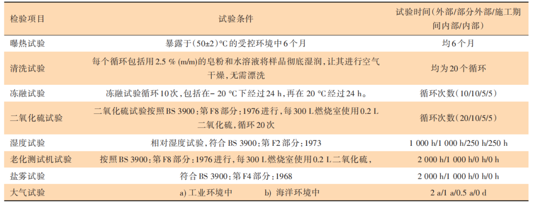 英國涂料標(biāo)準(zhǔn)也按照環(huán)境類型的不同對涂料進(jìn)行了分類,英國標(biāo)準(zhǔn)對每一類涂料都進(jìn)行比較全面的試驗(yàn)。該標(biāo)準(zhǔn)比較顯著的特征是各試驗(yàn)耗時(shí)較長,最長的自然暴露試驗(yàn)時(shí)間長達(dá)兩年,老化試驗(yàn)和鹽霧試驗(yàn)也需要2000 h。