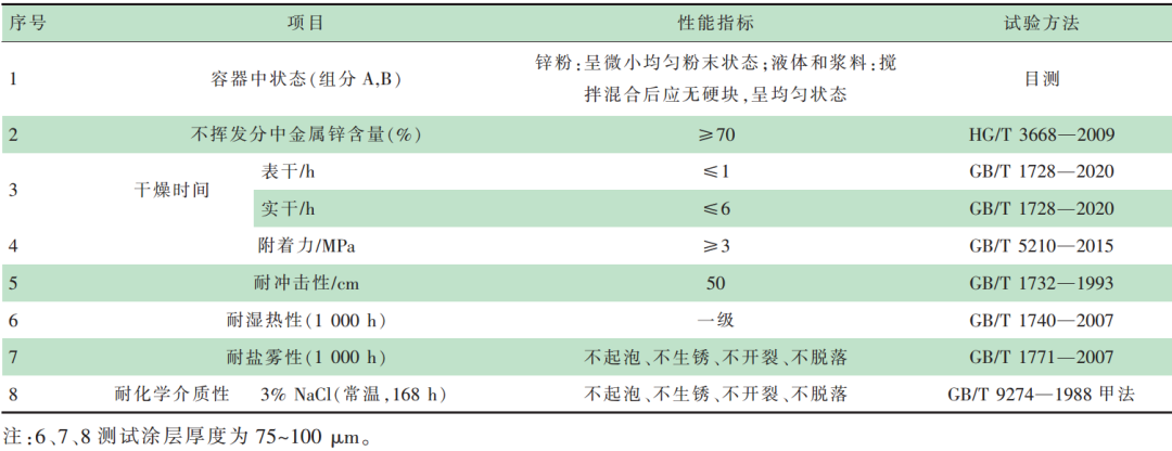 浮船基材需要在廠房中進(jìn)行底漆的預(yù)制噴涂,并且干膜厚度不宜過厚,否則涂層會(huì)發(fā)生開裂從而失去防腐作用,一般干膜厚度推薦在50~100μm,具體要求根據(jù)設(shè)計(jì)的不同而定。水性無機(jī)富鋅涂料的施工方式可以選擇刷涂、輥涂或者噴涂。在大面積施工前,需要對一些特殊部位,例如異形結(jié)構(gòu)、焊縫邊緣等地方進(jìn)行預(yù)涂,保證每個(gè)部位都被涂層覆蓋。水性無機(jī)富鋅涂料的固化需要水的參與,但是空氣濕度過大,又會(huì)影響涂層中水分的揮發(fā),推薦施工養(yǎng)護(hù)的環(huán)境濕度為60%~80%。性能見表1。